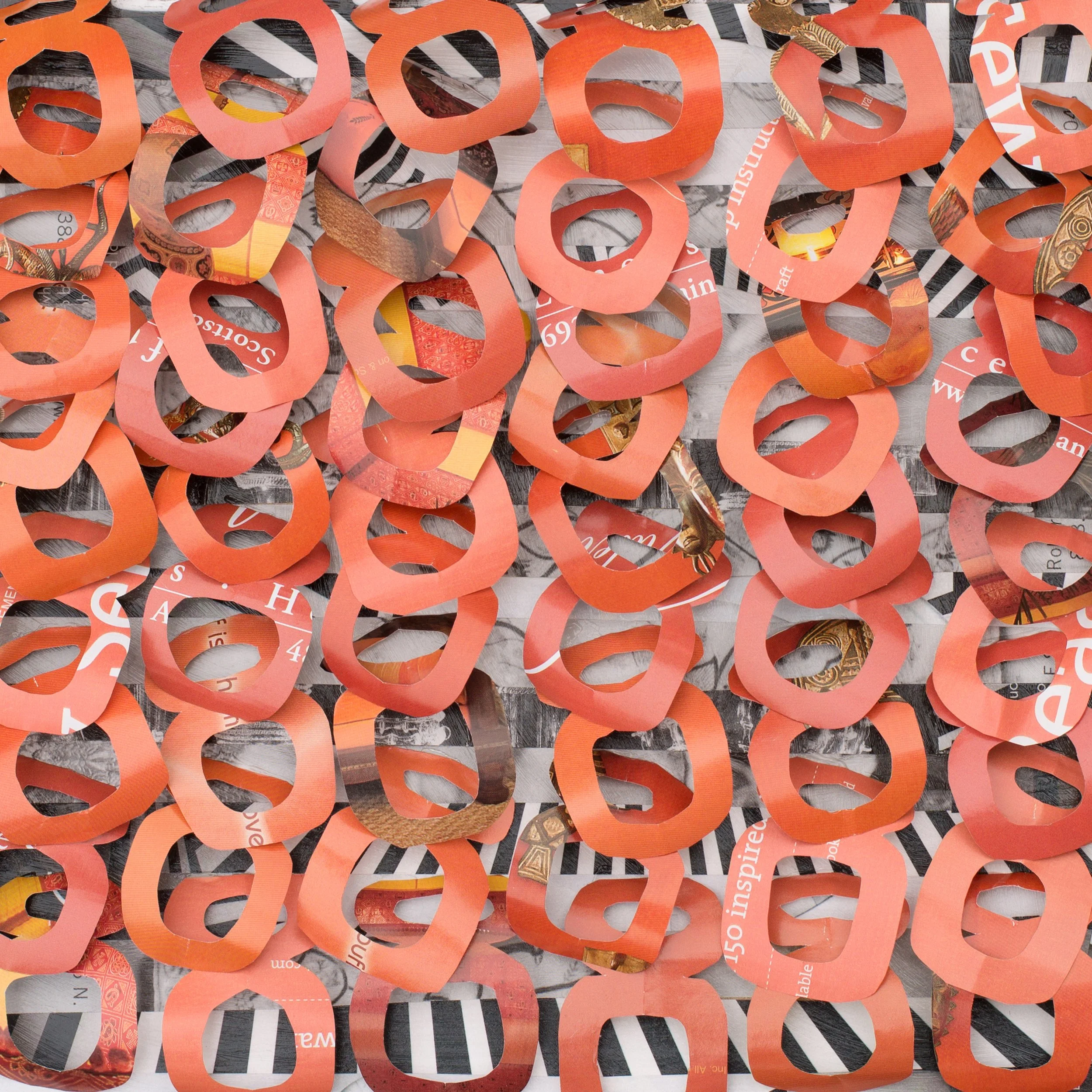 Composed three-dimensional paper mosaics, where layers of color, texture, and typography emerge from the printed fragments of everyday media