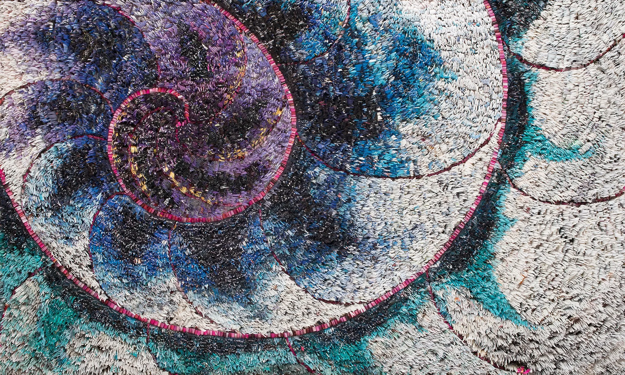 Composed three-dimensional paper mosaics, where layers of color, texture, and typography emerge from the printed fragments of everyday media